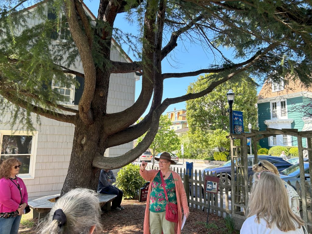 Conner led Zwaanendael Museum guests on a naturalist’s guide to downtown Lewes, pointing out native and non-native plants that grow in the garden plots of the town’s urban areas and what their historic uses were for the native populations and early settlers in Delaware. One notable sighting is the cedar tree that sits just across from the Zwaanendael Museum and is the same type of tree that provided the siding for the historic house that shares its yard. Another is thistle, a native plant that is also edible.